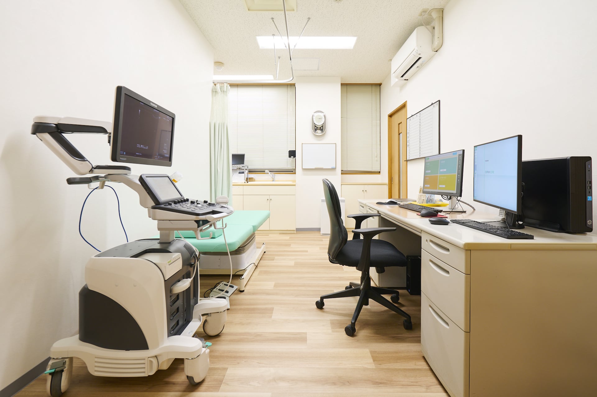 FUJIFILMのARIETTA 650 DeepInsightを使用しております。高画質技術を搭載し、質の高い診断を支えております。当院では造影エコー検査や超音波エラストグラフィも行っております。超音波エラストグラフィはShear Wave Measurement (SWM)/ Attenuation計測(ATT)を導入しております。SWMでは伝搬速度(Vs)を計測することで肝臓の硬さを定量的に評価できます。これにより従来は肝生検で評価されていた線維化が侵襲的な処置なく評価できるようになっております。ATTでは肝臓の脂肪化の程度を推測する指標となります。こちらも肝生検で評価していた脂肪量の指標も侵襲なく評価できるようになっております。
